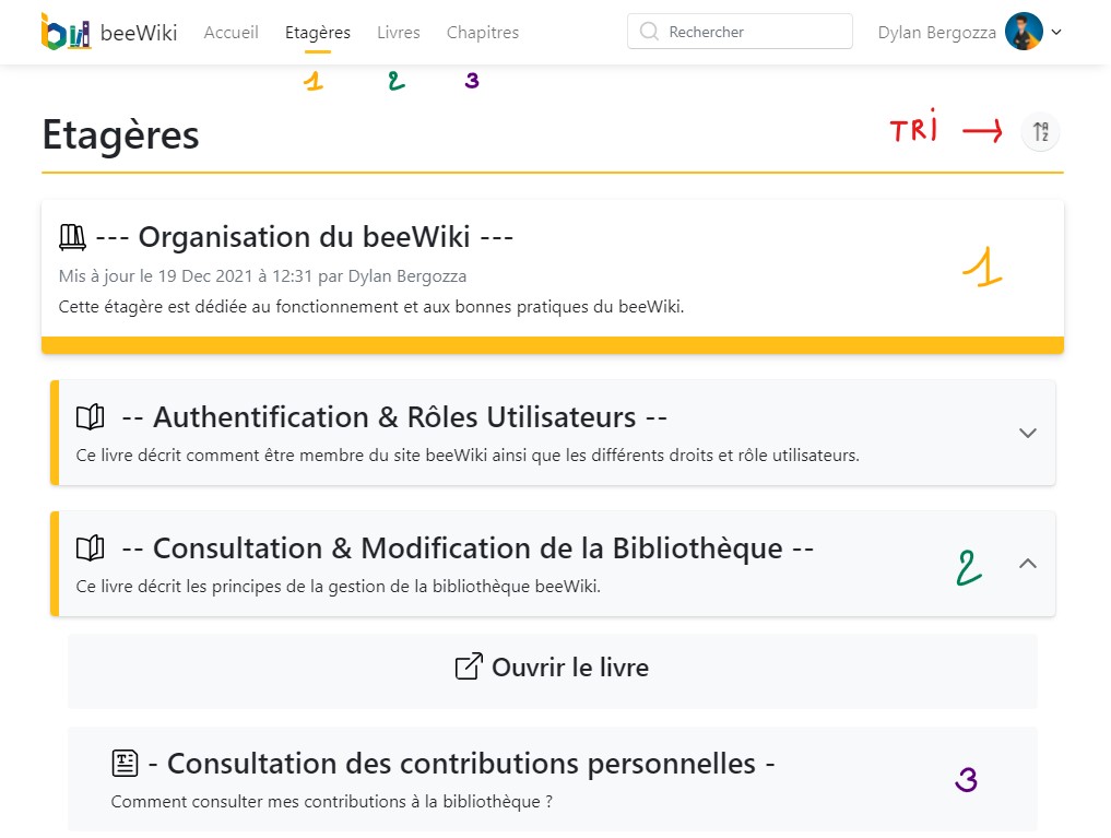Le site beeWiki est organisé à la manière d'une Bibliothèque ! Les utilisateurs peuvent ainsi monter des 1) Etagères, qui représentent les grands thèmes qu'ils souhaitent aborder, y déposer des 2) Livres pour les différents sujets traités, et enrichir ces derniers de 3) Chapitres qui constituent la base de connaissance.