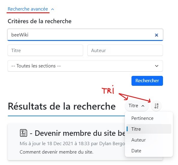 - Soit une recherche classique par pertinence depuis le titre, la description et le contenu de chaque section;