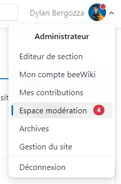 Lorsque du contenu est en attente de modération, l'utilisateur peut voir une notification en rouge sur sa photo de profil, ainsi qu'a côté du menu "Espace modération", indiquant le nombre des Section & Commentaire en attente de modération.