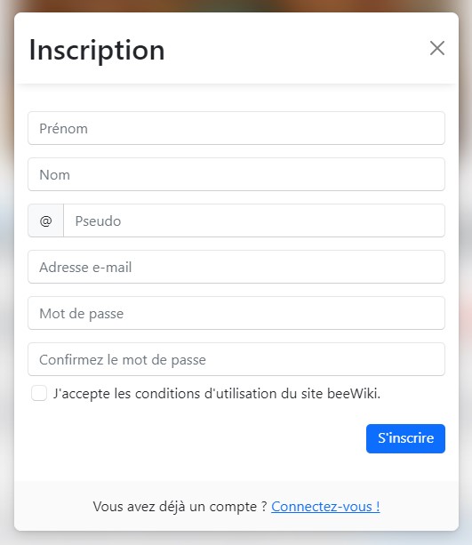 Toutefois, pour accéder aux sections privées, commenter les sections, ou contribuer à l'enrichissement du beeWiki, il est nécéssaire d'ouvrir un compte de membre en quelques secondes.