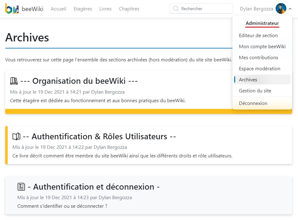 Les administrateurs, quant à eux, possèdent l'ensemble des droits de consultation, modification, création, modération, archivage et suppression des sections et des commentaires.